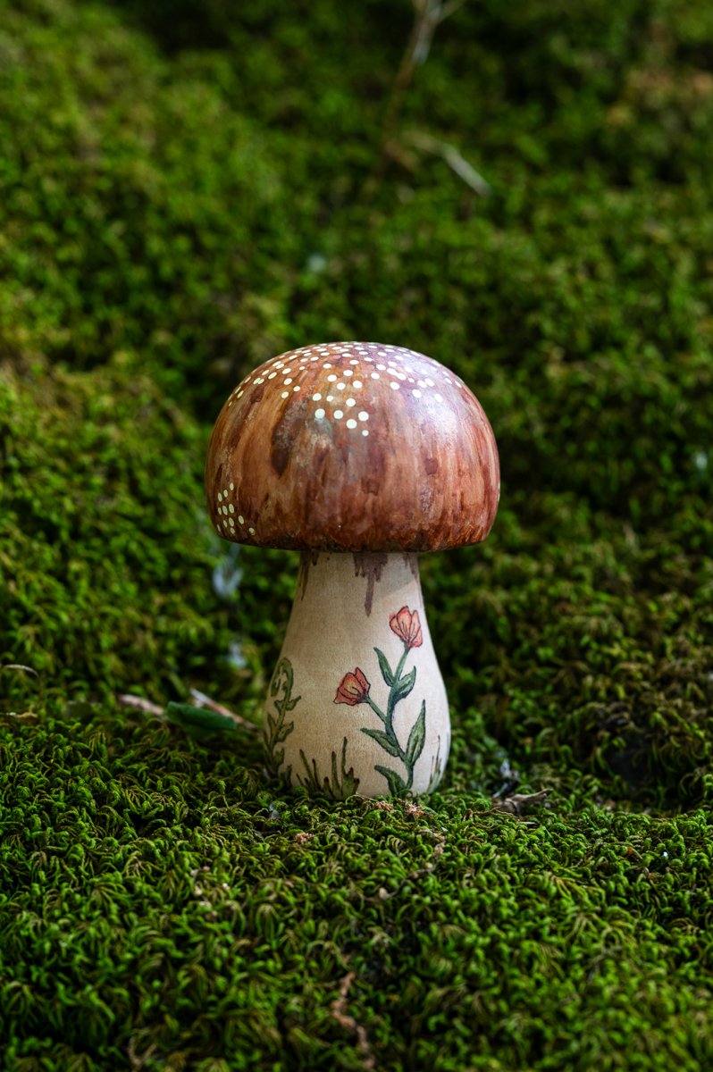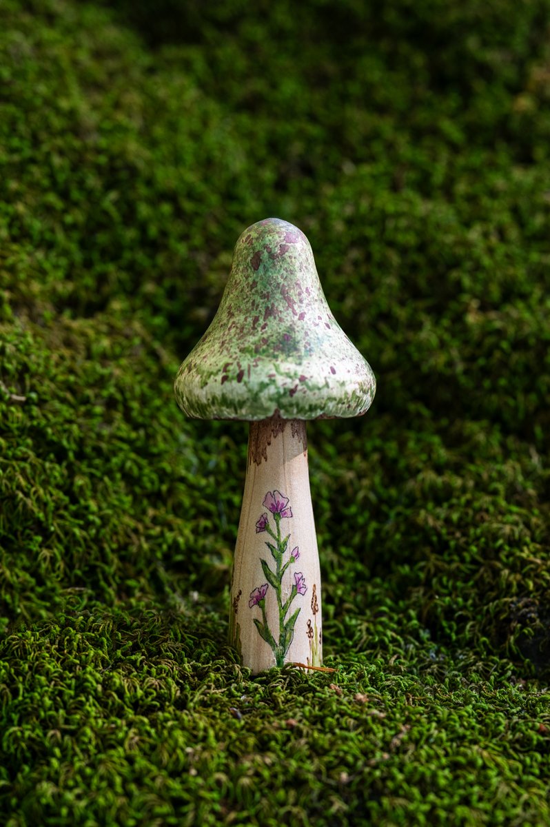 The Toadstool Assembly was created to honor the fruits of fungi, mushrooms. Our ecosystems and the life within them rely on the diversity and sheer number of fungi that quietly sustain nearly all living things. Each mushroom in the collection has wood-burned gills and a bit of decorative grass detail. We then add water color, ink, and acrylic paint to infuse character and depth to the different varieties. With over ninety percent of fungal species undocumented, we invite you to explore some of ours. All are named and are meant to inspire further exploration into this fascinating kingdom.