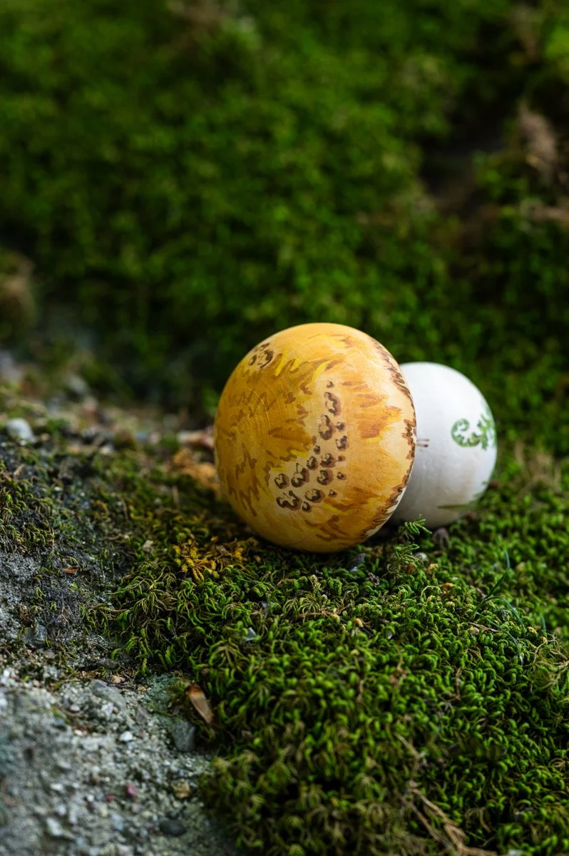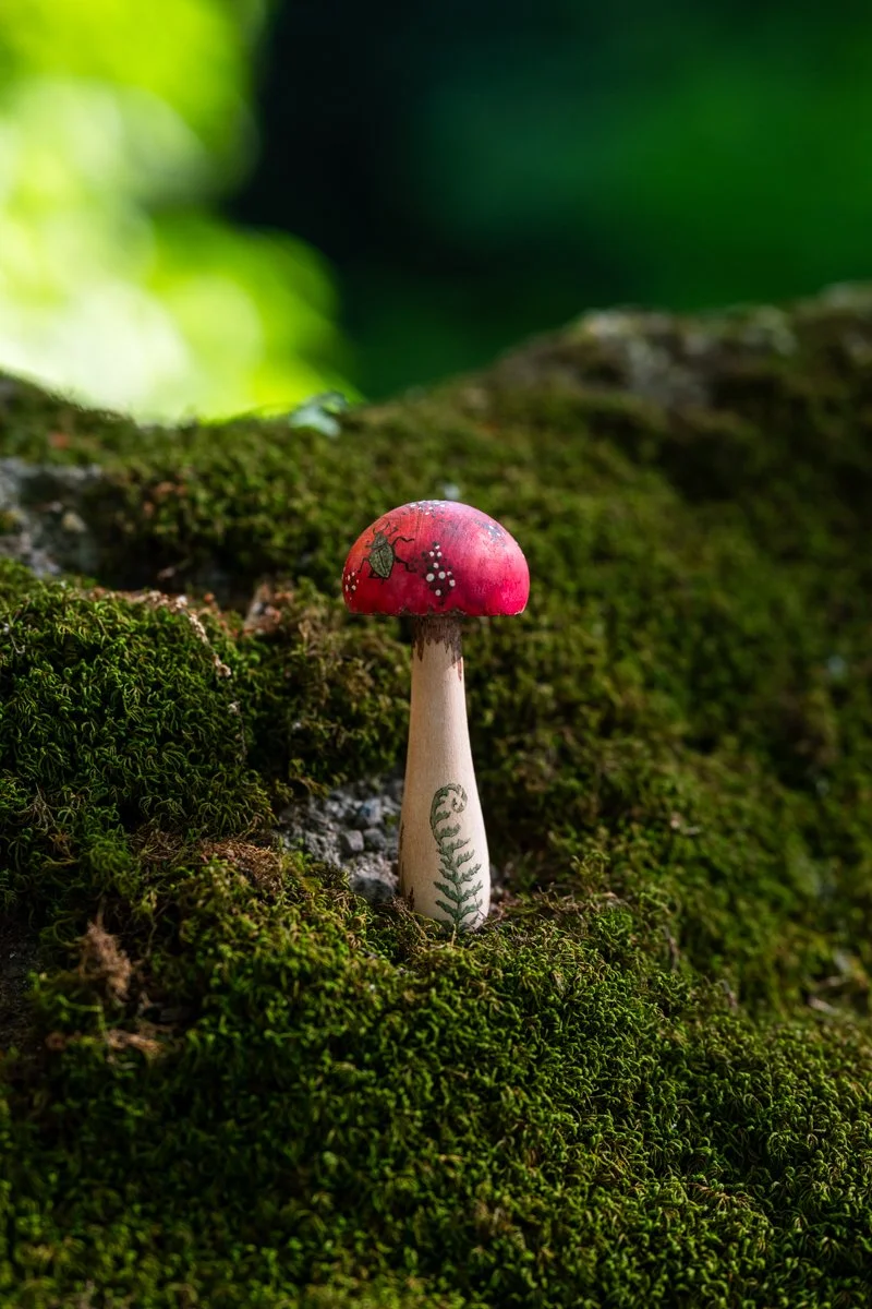 The Toadstool Assembly was created to honor the fruits of fungi, mushrooms. Our ecosystems and the life within them rely on the diversity and sheer number of fungi that quietly sustain nearly all living things. Each mushroom in the collection has wood-burned gills and a bit of decorative grass detail. We then add water color, ink, and acrylic paint to infuse character and depth to the different varieties. With over ninety percent of fungal species undocumented, we invite you to explore some of ours. All are named and are meant to inspire further exploration into this fascinating kingdom.